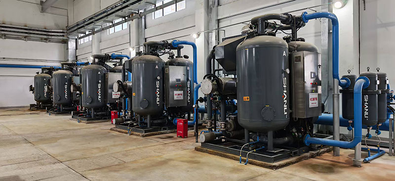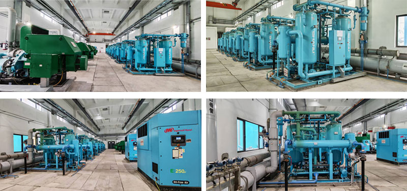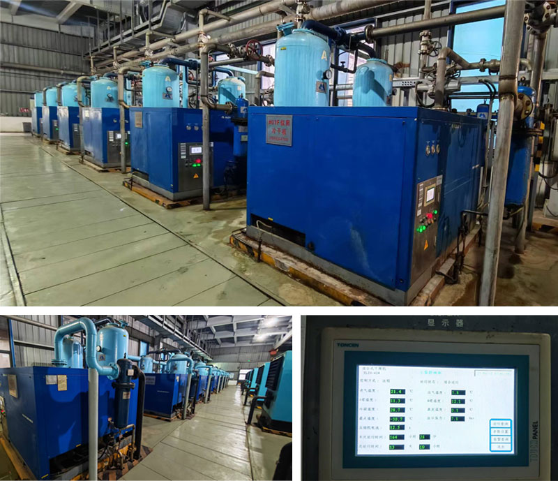 另外本工程还配置了5台离心式空压机和2台无油螺杆式空压机,同步配置我司7台压缩热再生吸附式干燥机和2台空气冷却器,供仪用、检修及厂内输灰输使用压缩空气。相比之前传统的微热、无热吸干机以及组合式干燥机设备,压缩热再生吸附式干燥机能效更优、运行成本更低,符合国家倡导的节能减排政策。